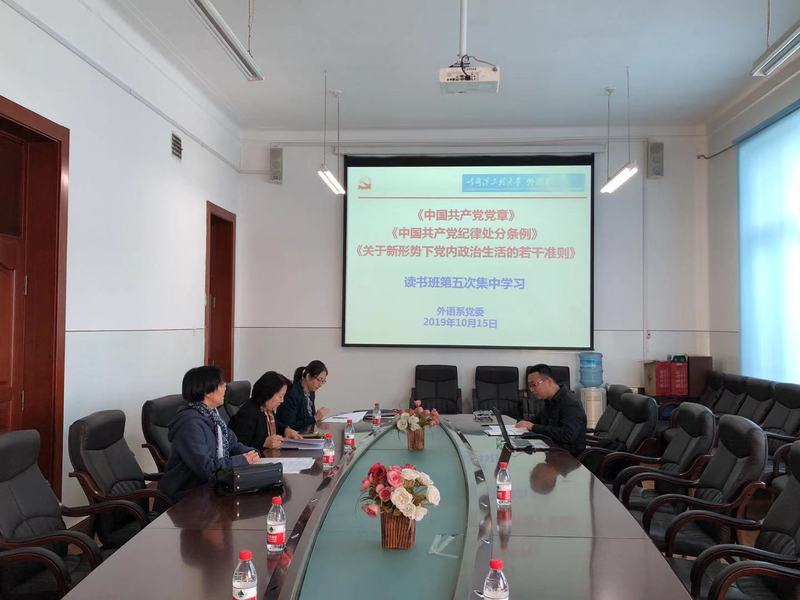 10月15日14:00,根据校党委统一部署,外语系领导班子在41#楼417组织开展了“不忘初心、牢记使命”读书班读原文学原著第五次集中学习。集中学习由系党委副书记安沛旺主持,班子成员陈岩、邓晓明、王丽丽出席。