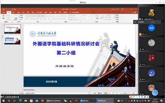 会议紧紧围绕两个议题进行探讨,大家献计献策。对于“外国语言文学科研平台建设与管理”这个议题,各位小组成员通过查资料做调研,思考与凝练,为学院的科研发展找症结、立方向、树目标、寻路径。孙寰老师在查阅欧美专家论文基础上提出了船海核特色发展之路,白晶老师在调研了上海外国语大学、北京外国语大学和大连外国语大学基础上提出了平台建设的跨学科与跨国路径,沈思老师在调研山东大学和湖南师范大学基础上提出了跨学科平台的管理与产出方案等,这些建议为探索形成良好的科研管理机制和落实举措提供了思路。关于重大项目申报和核心期刊论文发表的堵点问题,各位小组成员梳理了自身与外部两方面的问题,并提出了稳定方向、团队合作、交流发展等举措。