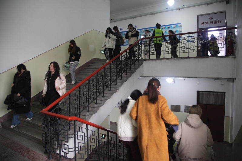 节水节能讲座后,组织参会师生开展了火灾疏散演练。