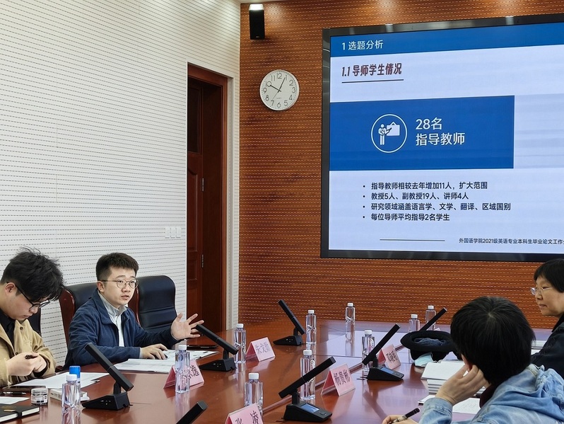 会上,朱戈勋代表学院作2025届英语专业本科生毕业论文工作介绍,重点汇报了毕设选题情况、阶段性工作进展、程序规范管理及后续推进计划等内容。督导专家听取汇报后,就中期检查整改落实情况、论文管理创新举措等问题进行提问和交流。