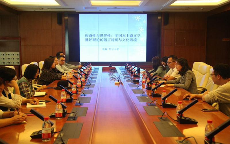陈靓教授以“族裔性与世界性:论美国本土裔文学批评理论的语言特质与文化语境”为题作主题报告,并就文学、语言学及翻译视域下区域国别研究项目和论文选题进行了专业指导。陈靓教授从当代美国本土裔文学批评的两个核心概念:民族主义与世界主义出发,梳理了本土裔文学批评理念的流变,并基于本土裔文学和文化特质,阐述了当代美国本土裔文学及批评理论的历史沿革、语言特质,以及在现代性下的族裔特质重构。