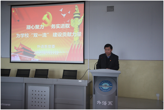 系党委书记赵欣同志代表上届分党委作了题为《凝心聚力 务实进取 为学校“双一流”建设贡献力量》的工作报告,对上届系党委四年来的工作情况进行了梳理和总结,肯定了系党委在发挥政治核心作用、学习十九大精神、落实全国思政工作会议精神、开展“两学一做”学习教育、开展群团工作及落实党风廉政建设责任制等方面工作取得的成绩,同时也指出党建工作与中心工作有机融合在“找点”方面需要进一步深化、在“双融合”“双促进”方面需要进一步加强。报告明确了外语系党委下一阶段工作任务,按照校党委工作部署和要求,以贯彻落实全国教育大会精神为主线,以“全国党建工作样板支部”创建为牵引,以党支部标准化规范化建设为抓手,以实现党务和中心工作有机融合为突破口,全面提高基层党建工作质量和水平,为学校“双一流”建设贡献力量。