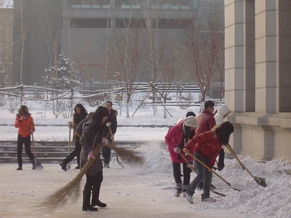 14日下午两点半,外语系组织本科生学生党员及10级新生对一号楼的南楼北楼之间区域的积雪进行了清扫。近日,哈市普降大雪,给同学们的日常出行带来了极大的不便。根据学校安排,各院系纷纷开展了积雪清扫工作。