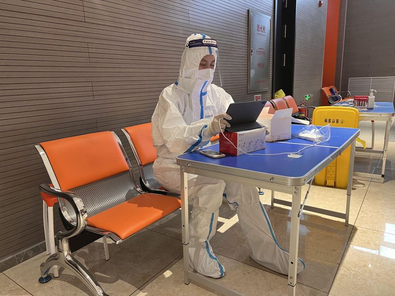 本次志愿服务工作为协助医护人员扫码、分组。三位教师按要求到达指定地点后,接受了软件使用及检测流程培训;在穿戴好防护服之后便立刻投入到工作之中。当日为校内师生抽检,但参检人数依然众多,每组需完成1200人的核酸检测。从12:30至17:00,志愿服务工作紧张有序地持续进行,在此期间不得脱下防护服,也不能离开岗位休息或喝水进食,三位教师克服困难,顺利完成了今日的志愿服务检测工作。