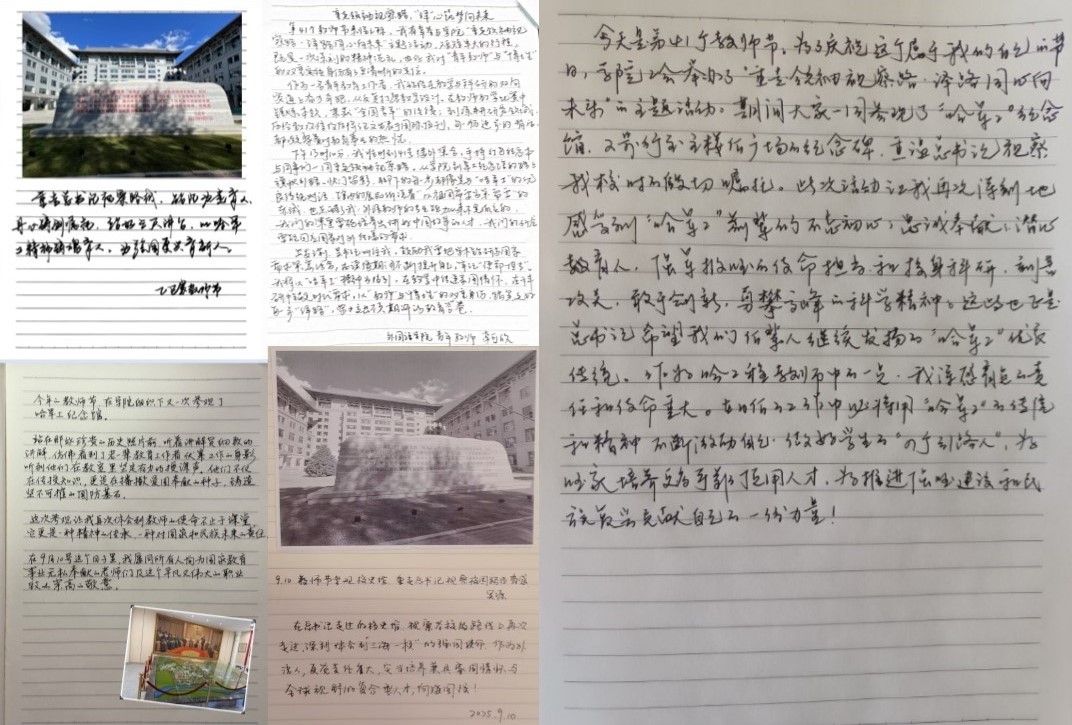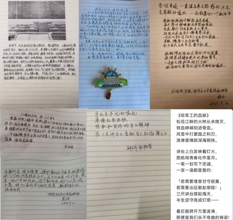 徒步活动结束后,教师们或蹲或立,神情专注,在活动纪念册上写下参与此次活动的点滴感悟,郑重许下为强国建设、民族复兴再立新功的誓言。教师们字里行间流淌着哈工程外语人对教育的热爱与思考,为党育人、为国育才的决心和使命感。