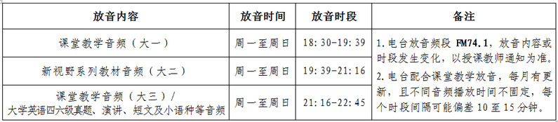 为满足同学们开展英语自主学习和自我训练的需求,外语系继续对全校学生开放外语网络学习资源和安排电台放音,具体安排如下: